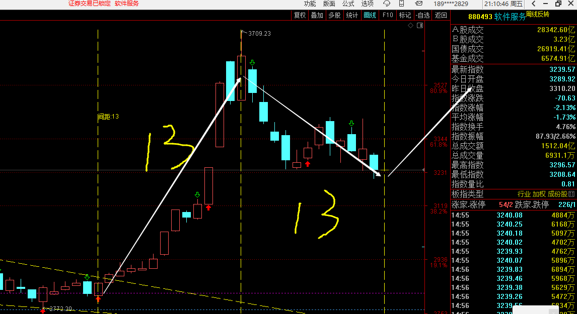 重点讲一下软件AI应用方向,软件和AI应用方向在昨天上午的盘面当中是有表现的,后来指数出现了跳水又把它拉下去了,今天AI应用方向表现也不理想,受到盘面的压制也把AI应用方向拉下去了,通过今天收盘之后我是把AI应用软件服务里面的个股全都看了一遍,软件里面有1/3的票已经回到了买线的位置,也就是说短期严重超跌,这个地方有反弹的需求,通过对软件服务指数的分析,如果以时间对称轴去计算,上涨是13个交易日那么这个地方下跌也是13个交易日,下个星期一软件服务指数就刚好是回调的第13天,也就是变盘的时间窗口