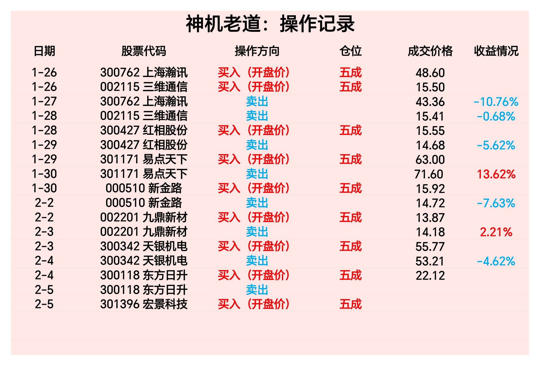 2月5作计划:开盘价买入:301396宏景科技(五成仓)收盘前卖出:3001