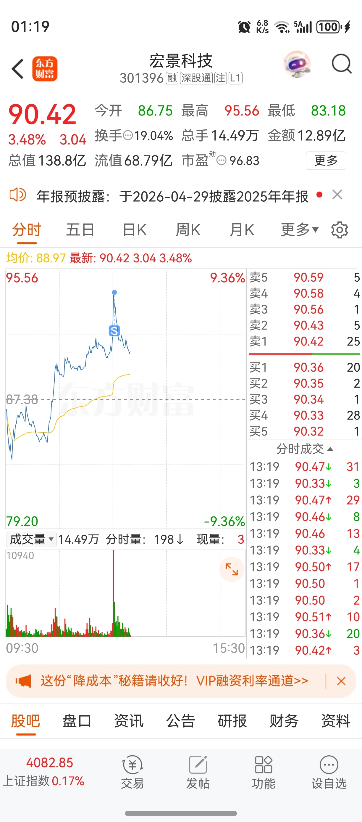 $宏景科技(SZ301396)$ 90.66高位抛了!等等再说