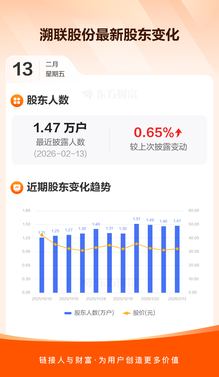 溯联股份最新披露数据显示,截至2月13日公司股东户数为1.47万户,较上期(2026年1月30日)增加95户,增幅为0.65%。户均持有流通股数量由上期的4833股下降至4802股,户均持股金额由上期的15.06万元增加至15.43万元。