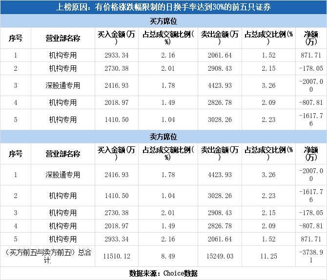 龙虎榜数据显示,今日共8个机构席位出现在龙虎榜单上,分别位列买一、买二、买四、买五、卖二、卖三、卖四、卖五,合计净卖出1731.91万元,占龙虎榜净卖额的46.32%。除此之外还有神农种业、多氟多、海南海药等47只个股榜单上出现了机构的身影,其中24家呈现机构净买入,获净买入最多的是神农种业,净买额为4.85亿元;23家呈现机构净卖出,其中遭净卖出最高的为美埃科技,净卖额为1.37亿元。