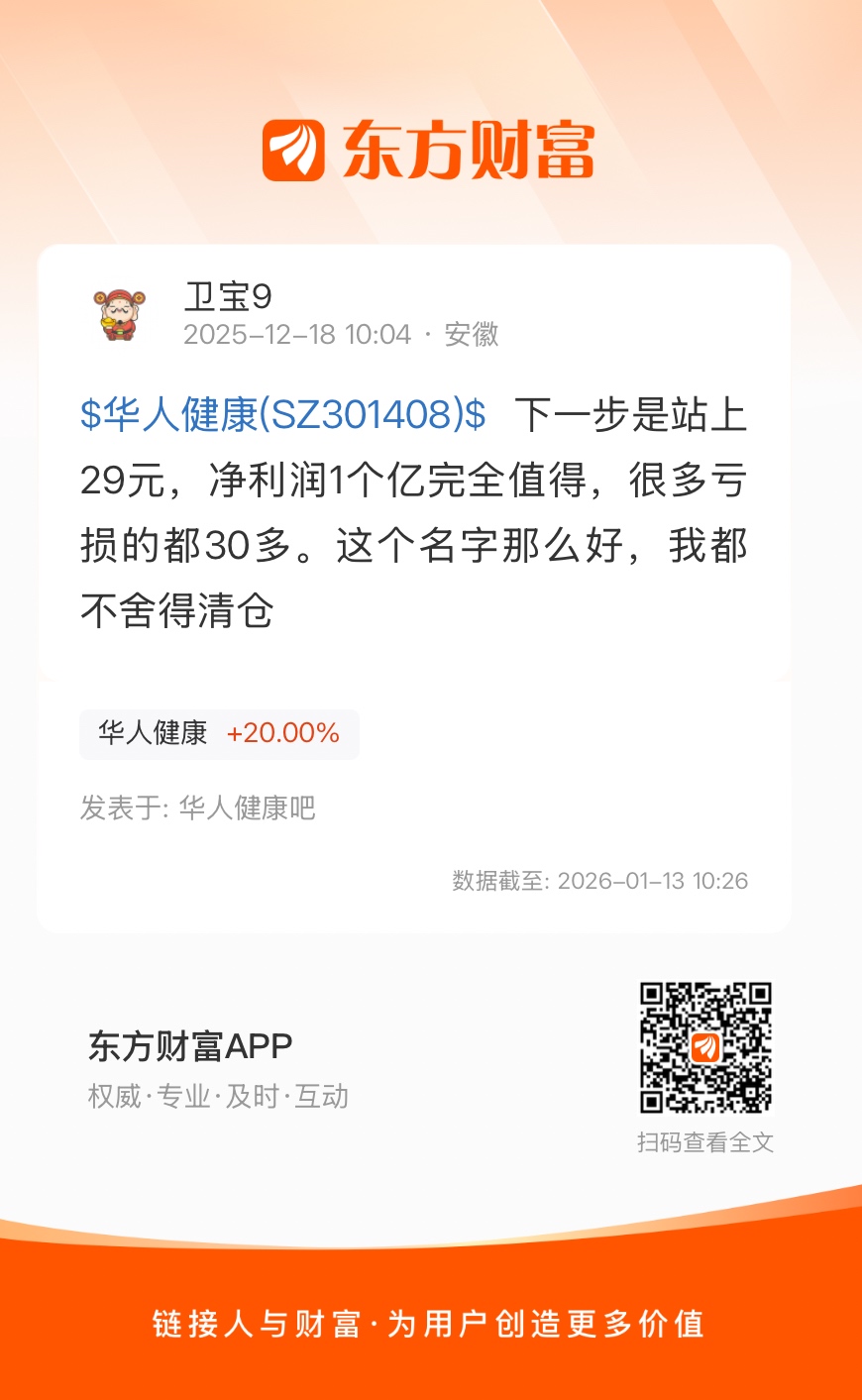 $华人健康(SZ301408)$  下一步是站上29元,净利润1个亿完全值得,很多亏损的都30多。这个名字那么好,我都不舍得清仓