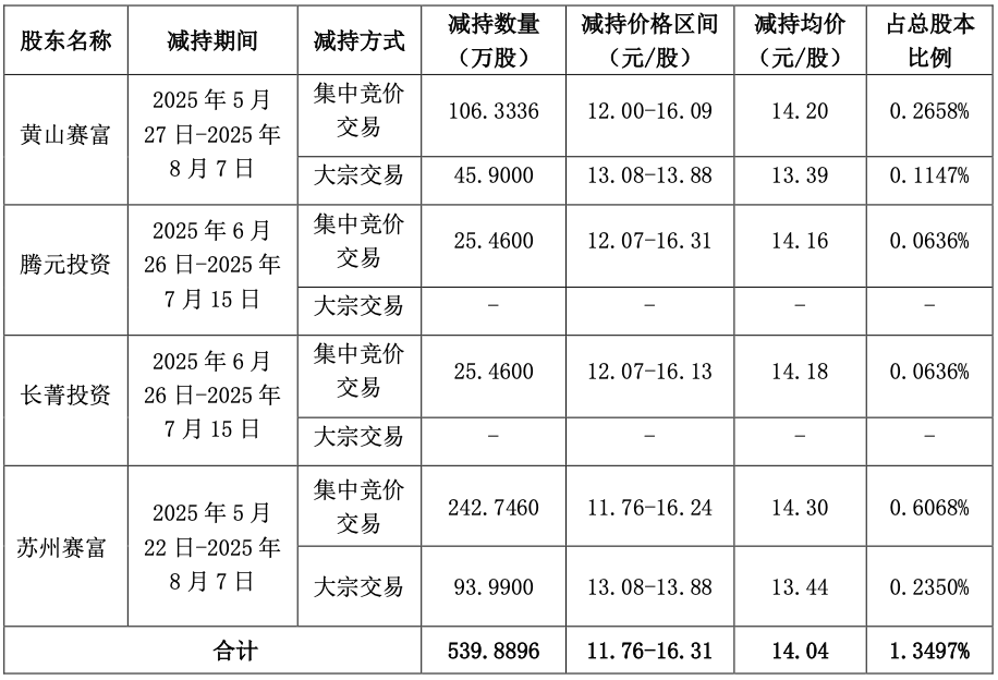 2025年8月15日,华人健康发布公告,公司于2025年8月14日收到股东黄山赛富、腾元投资、长菁投资、苏州赛富出具的《关于合计持股5%以上股东减持时间届满暨减持结果的告知函》,获悉黄山赛富、腾元投资、长菁投资、苏州赛富减持计划已到期,在减持计划实施期间,黄山赛富、腾元投资、长菁投资、苏州赛富通过集中竞价及大宗交易的方式合计减持公司股份539.8896万股,减持股份占公司总股本的比例为1.3497%。
