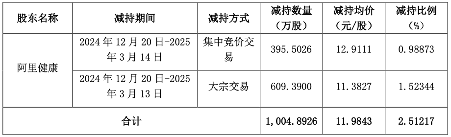 2025年3月17日,华人健康公告称,股东阿里健康减持计划时间届满,期间累计减持公司股份1004.89万股,占总股本的2.51%,以均价11.98元/股计算,合计套现超1.2亿元。此次减持后,阿里健康持股比例由7.51%降至4.99999%,退出持股5%以上股东行列。