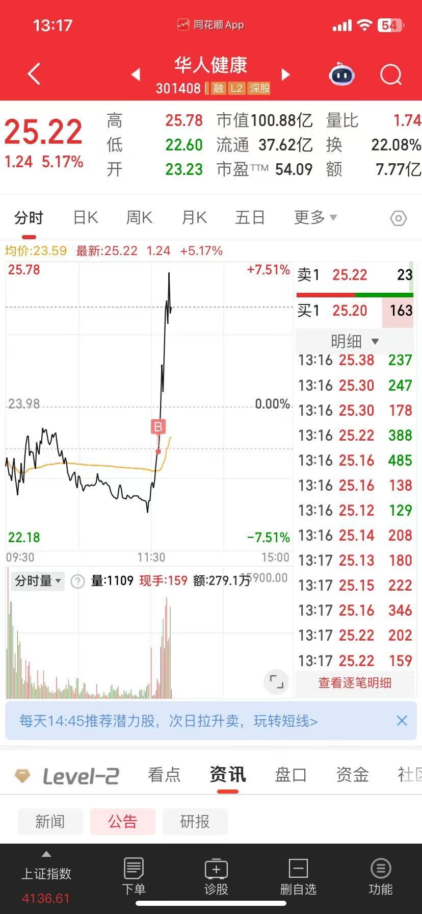 23.4水下低吸介入$华人健康(SZ301408)$