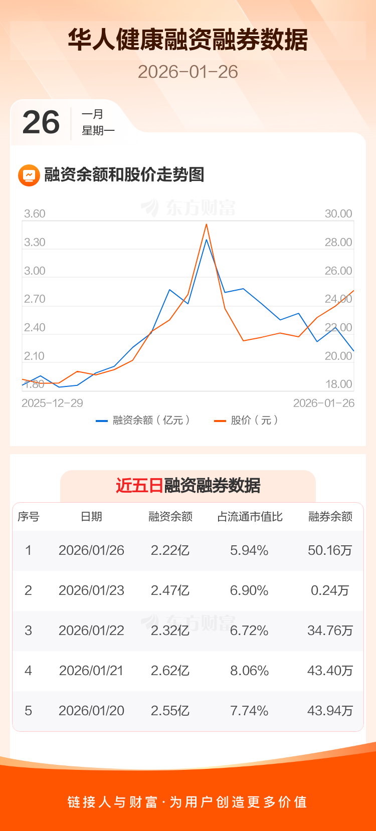 交易所最新数据显示,华人健康于2026年1月26日获融资买入9647.93万元,融资偿还1.21亿元,当日融资净偿还2474.23万元。目前,该股融资余额2.22亿,占流通市值比例为5.94%。