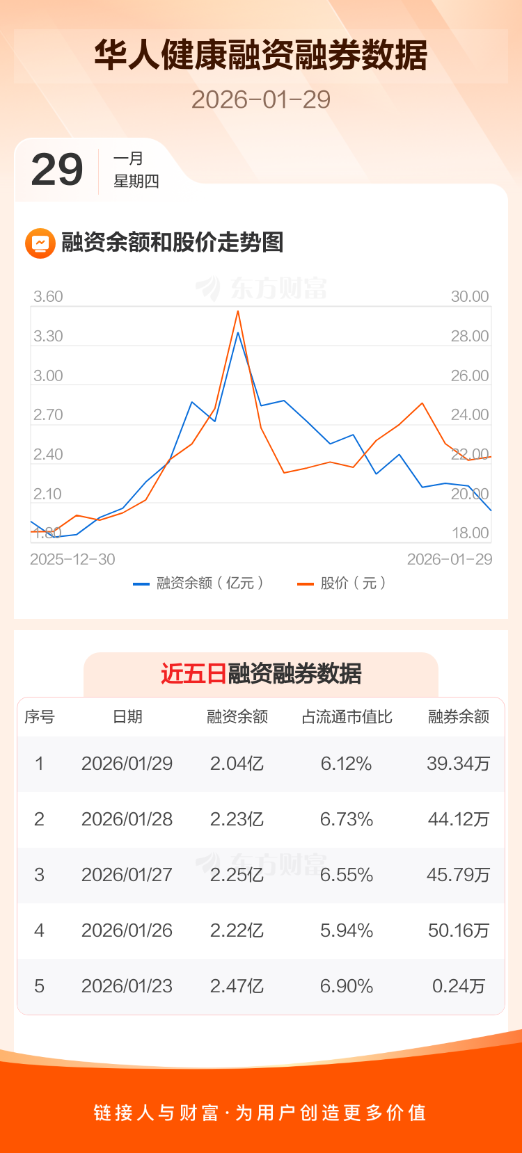 交易所最新数据显示,华人健康于2026年1月29日获融资买入4539.26万元,融资偿还6389.00万元,当日融资净偿还1849.74万元。目前,该股融资余额2.04亿,占流通市值比例为6.12%。