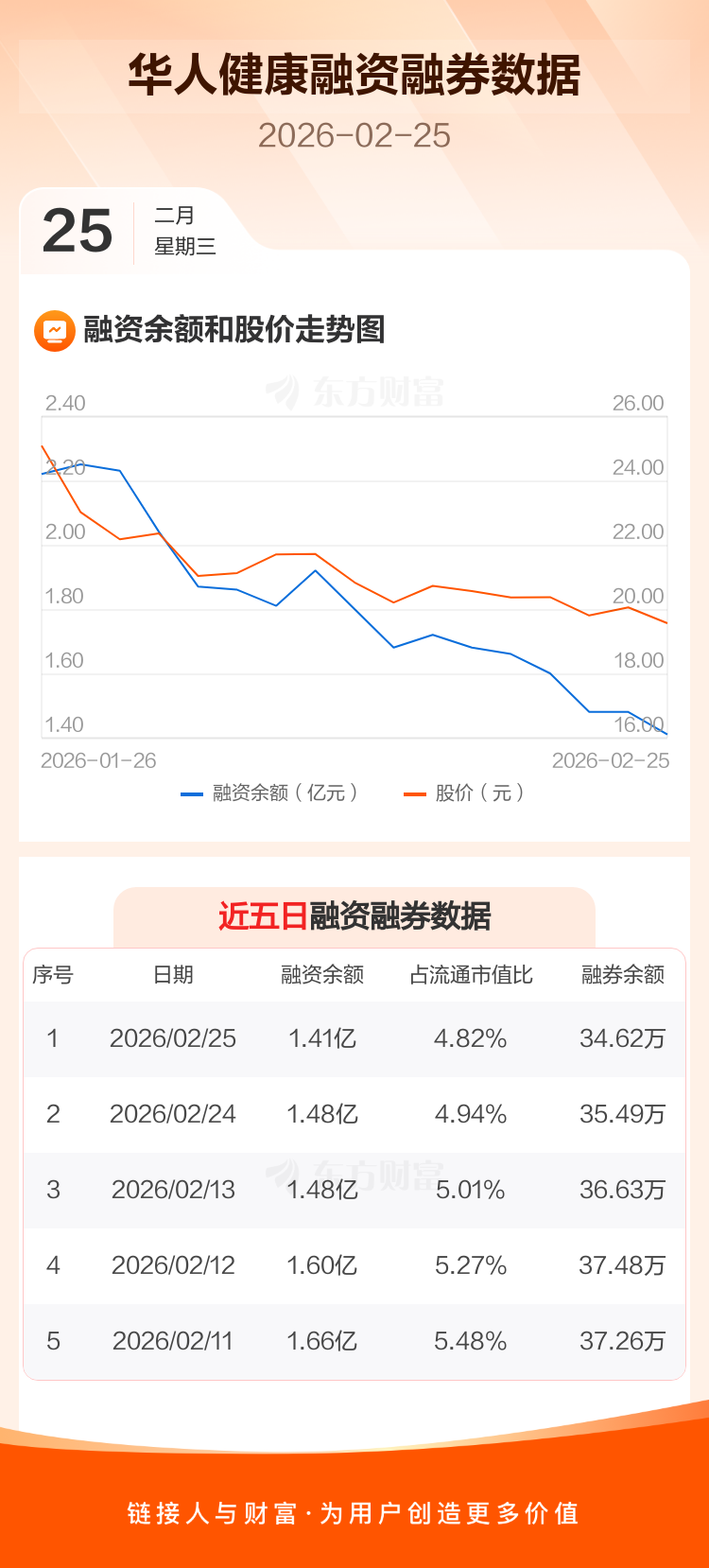 交易所最新数据显示,华人健康于2026年2月25日获融资买入1898.34万元,融资偿还2615.39万元,当日融资净偿还717.05万元。目前,该股融资余额1.41亿,占流通市值比例为4.82%。