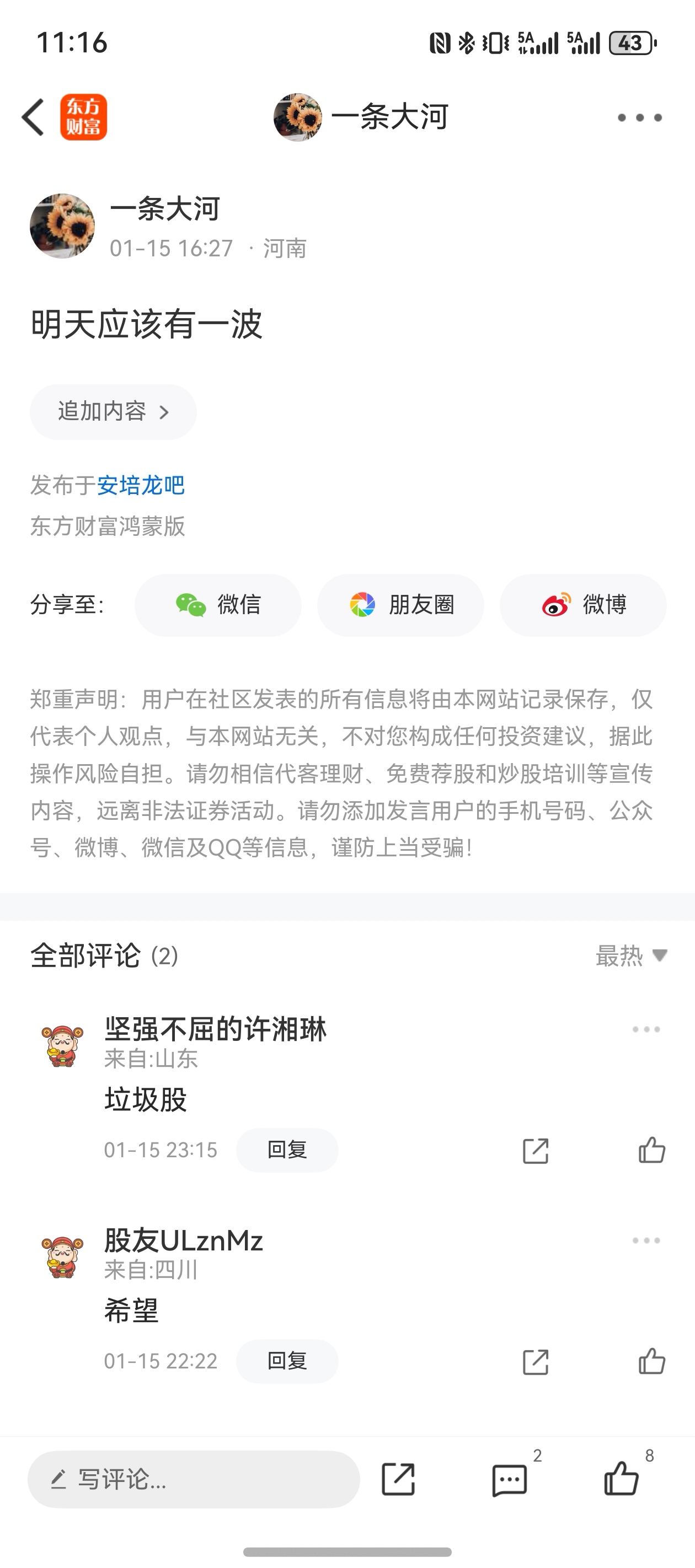 温馨提示: 1.根据《证券法》规定,禁止编造、传播虚假信息或者误导性信息,扰乱证券市场;2.用户在本社区发表的所有资料、言论等仅代表个人观点,与本网站立场无关,不对您构成任何投资建议。用户应基于自己的独立判断,自行决定证券投资并承担相应风险。《东方财富社区管理规定》