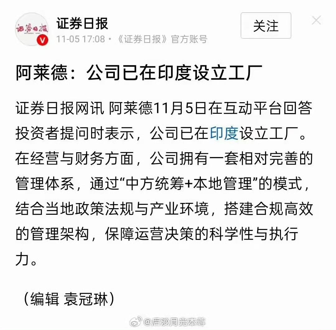 $阿莱德(SZ301419)$ 阿莱德在印度设厂
