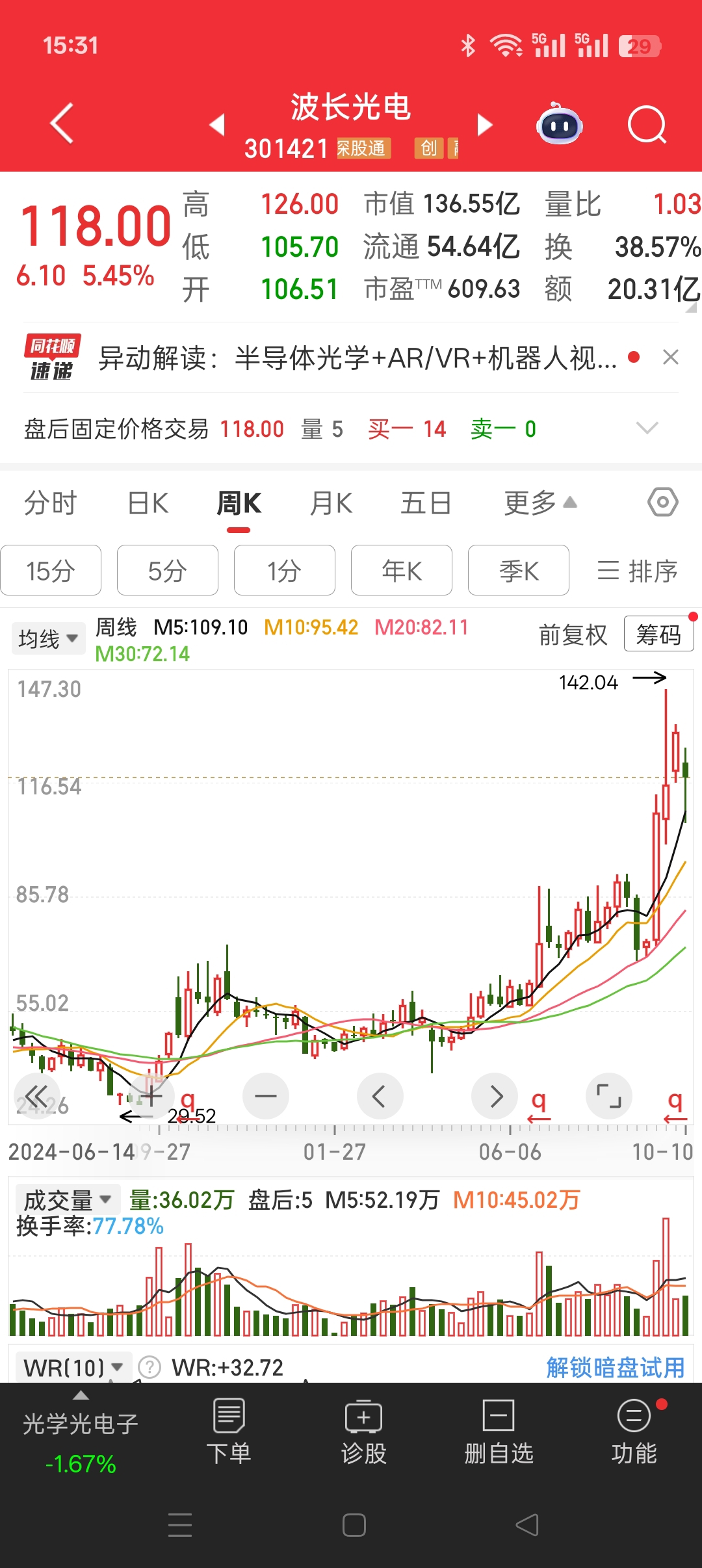 $波长光电(SZ301421)$ 中线拿好,106的黄金支撑回踩已基本成立,106*1.71=181.26这个月必须干到这个价格,不到这个价格不卖,否则你不要来做股票。我说的,信不信由你吧!!!!