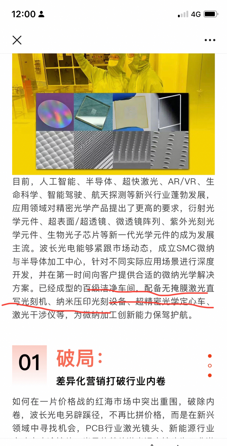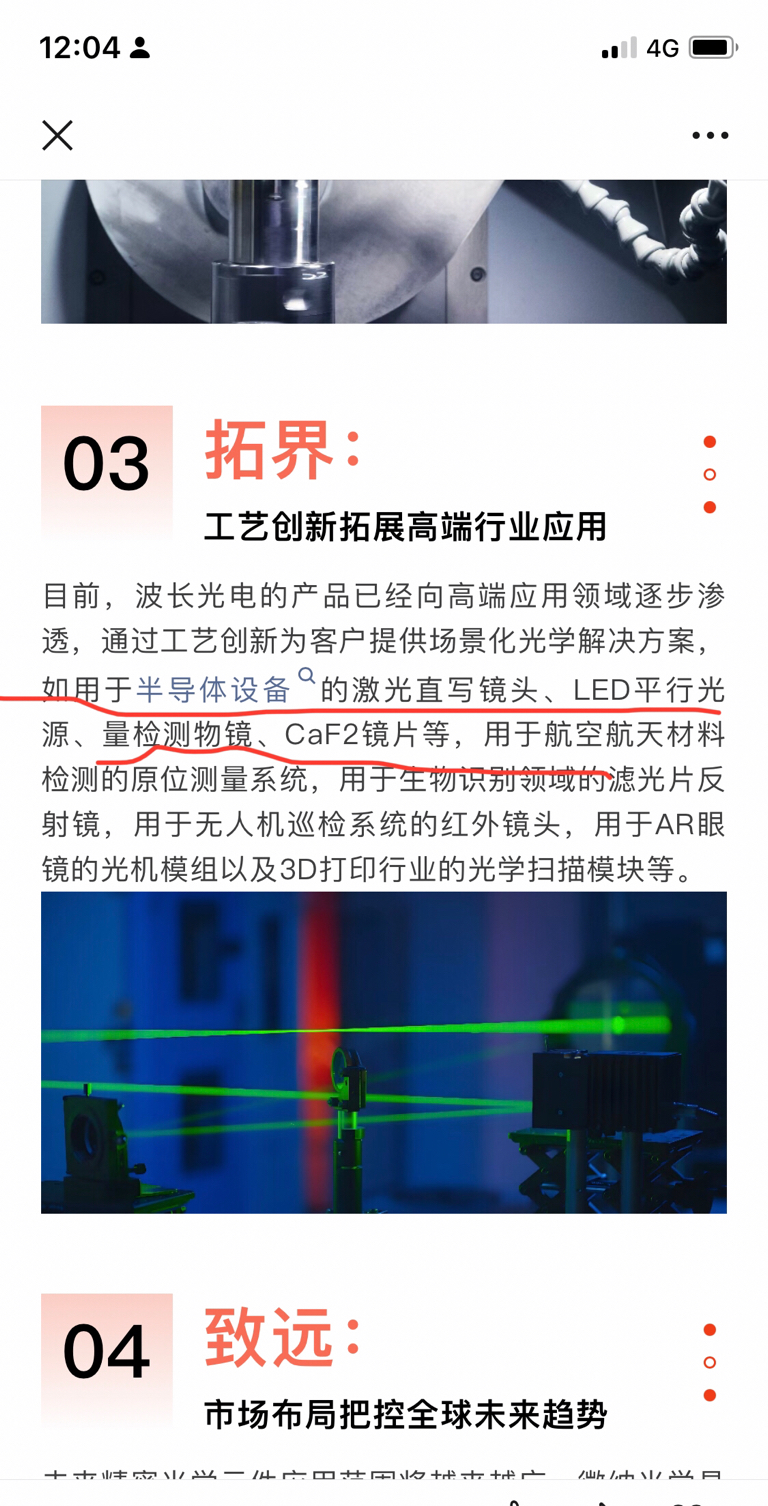 波长光电的产品已经向高端应用领域逐步渗透,通过工艺创新为客户提供场景化光学解决方案,如用于半导体设备的激光直写镜头、LED平行光源、量检测物镜、CaF2镜片等,用于航空航天材料检测的原位测量系统,用于生物识别领域的滤光片反射镜,用于无人机巡检系统的红外镜头,用于AR眼镜的光机模组以及3D打印行业的光学扫描模块等。
