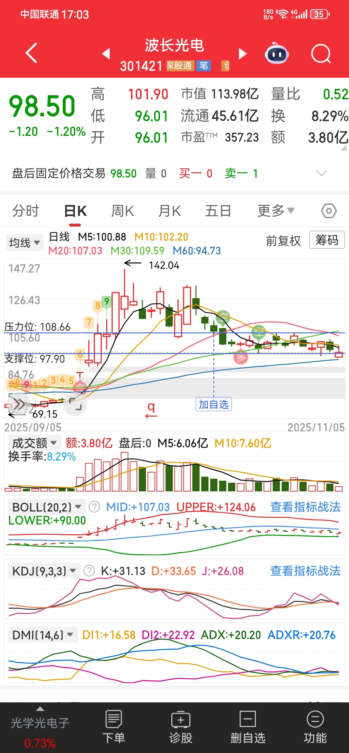 $波长光电(SZ301421)$ 进一步缩量,底部。站稳60日线。等布林带口打开