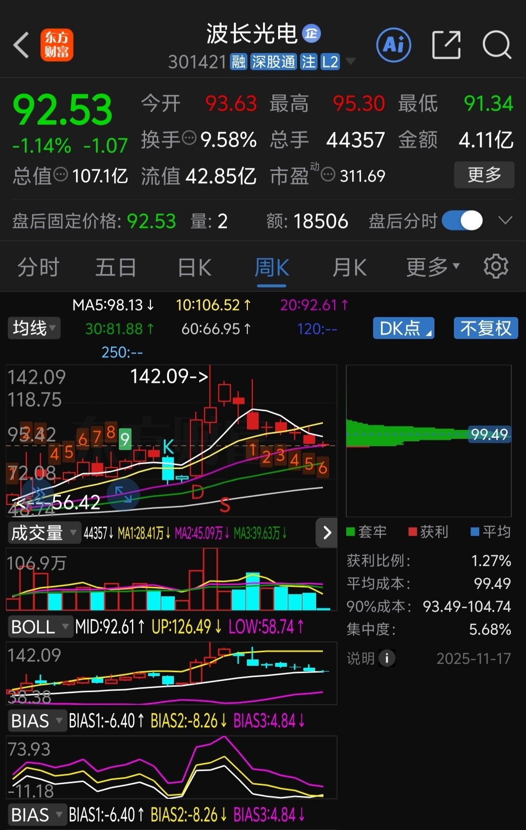 $波长光电(SZ301421)$ 波长自142跌至92,跌幅35%,几乎连跌7周,够狠!
