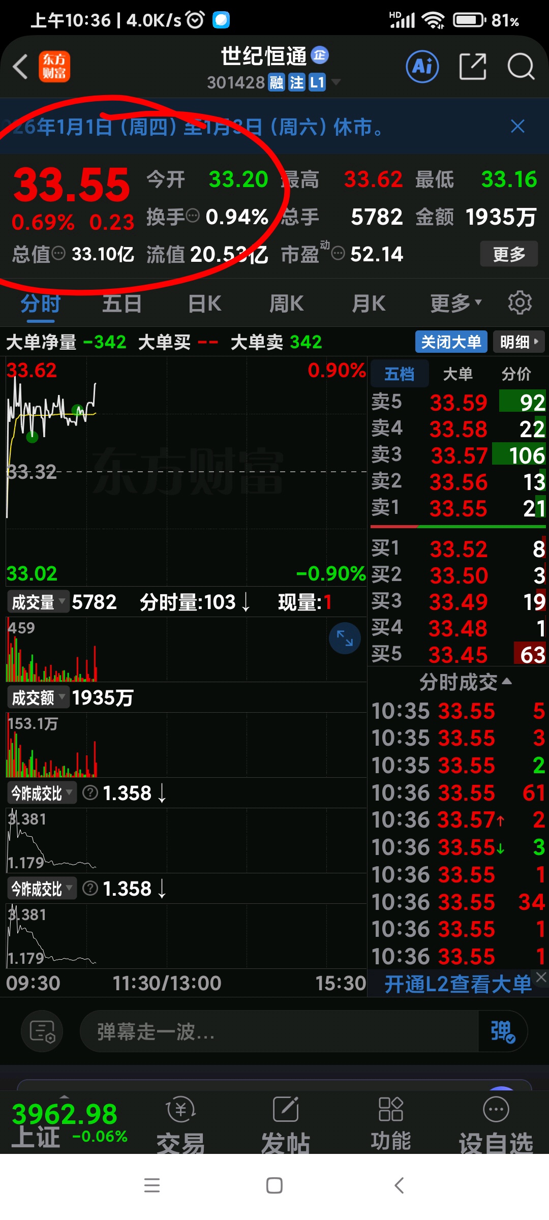 $世纪恒通(SZ301428)$ 昨天33.33,今天33.55 是风水先生