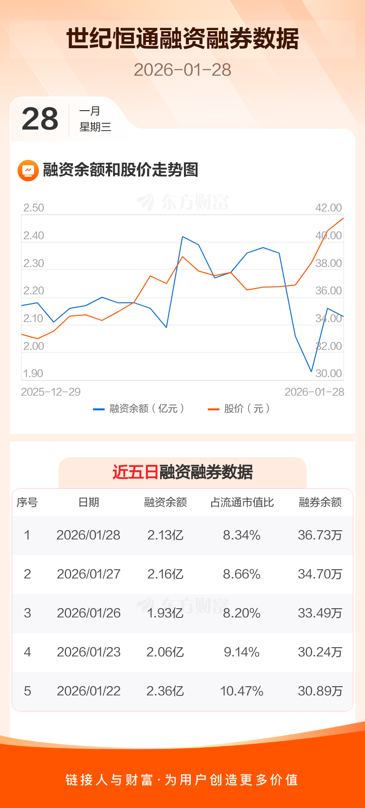 交易所最新数据显示,世纪恒通于2026年1月28日获融资买入8993.67万元,融资偿还9321.17万元,当日融资净偿还327.5万元。目前,该股融资余额2.13亿,占流通市值比例为8.34%。