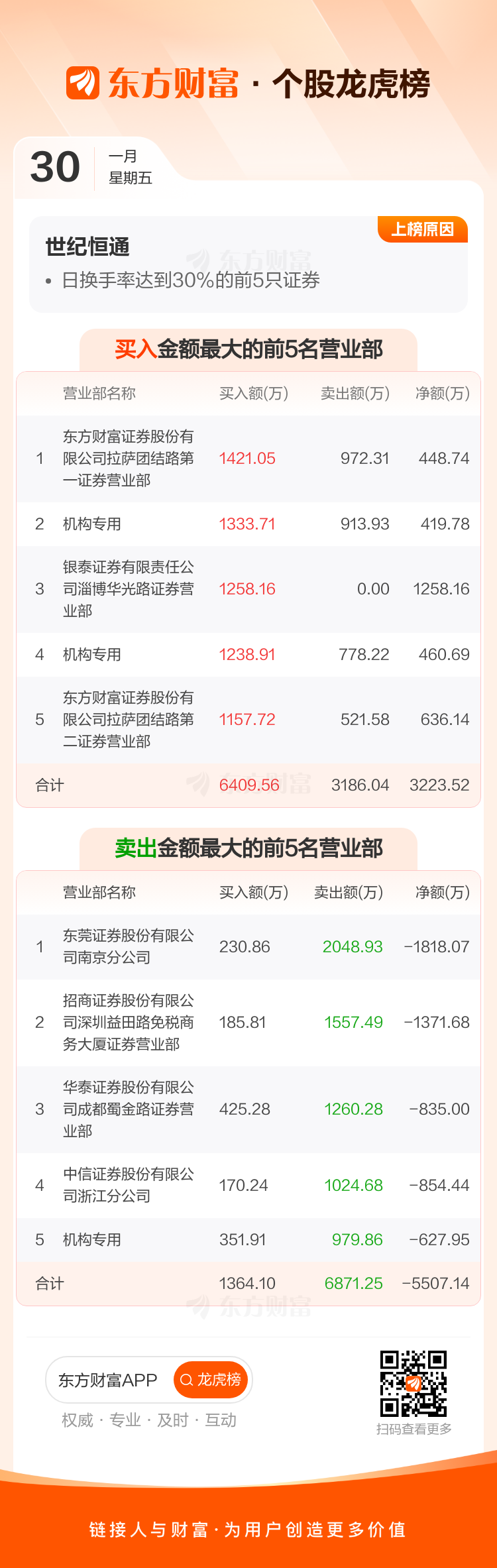 交易所2026年1月30日公布的交易公开信息显示,世纪恒通因成为日换手率达到30%的前5只证券上榜。世纪恒通当日收报45.2元,涨跌幅4.56%,偏离值34.20%,换手率34.27%,成交额9.15亿。