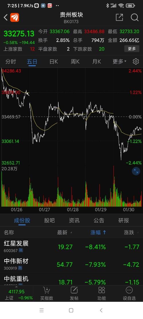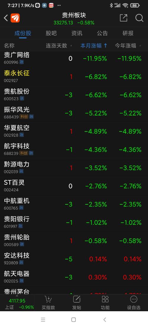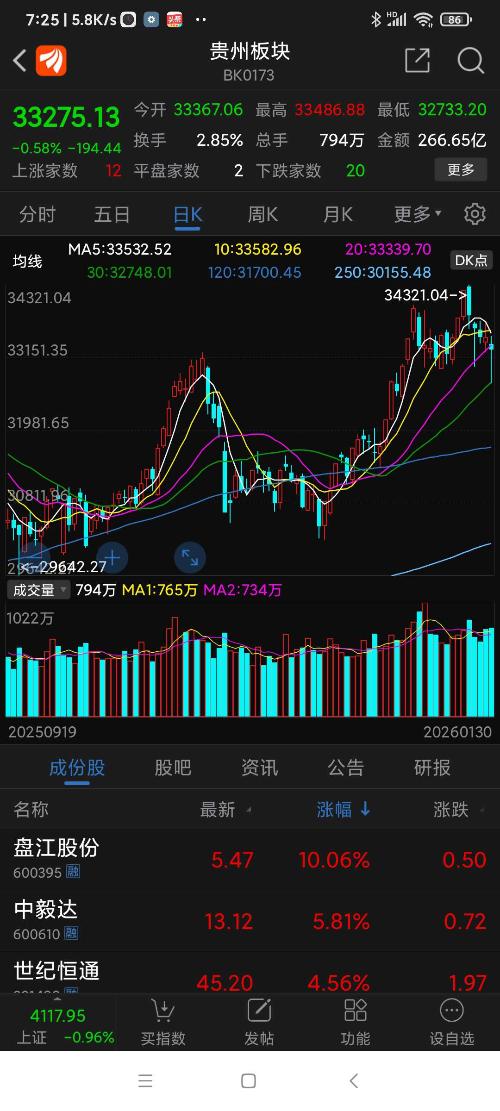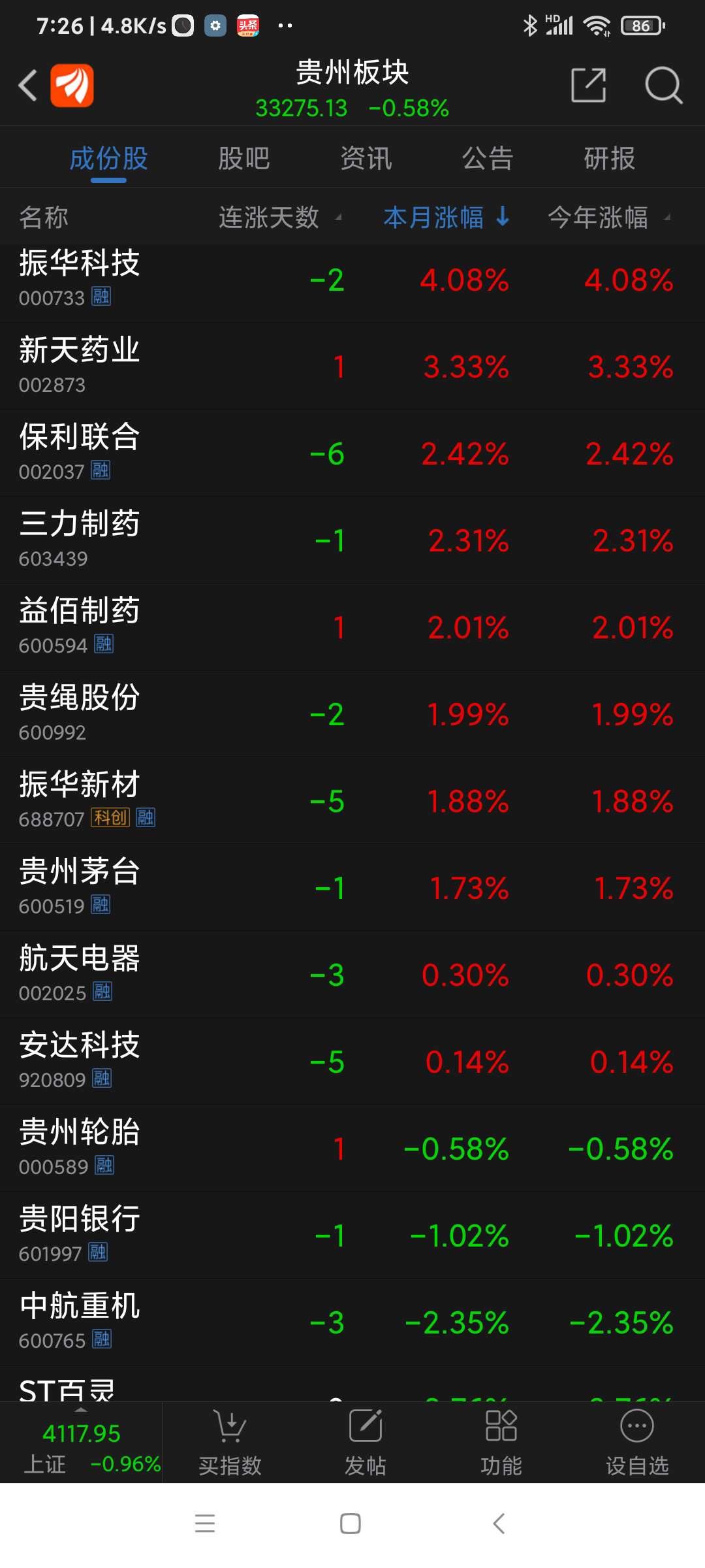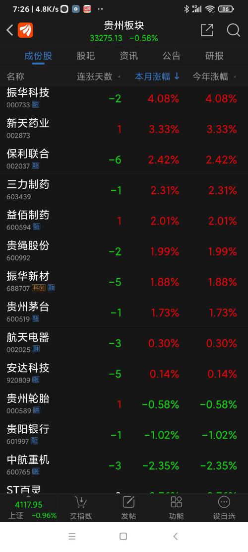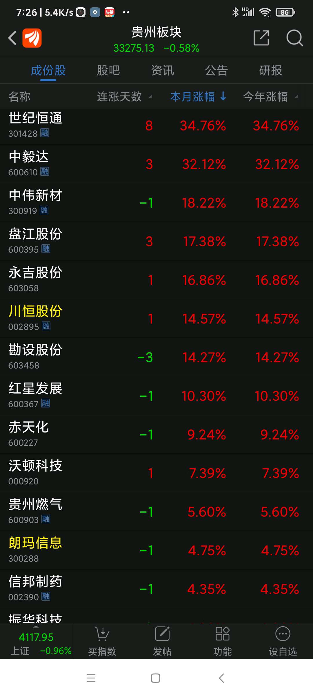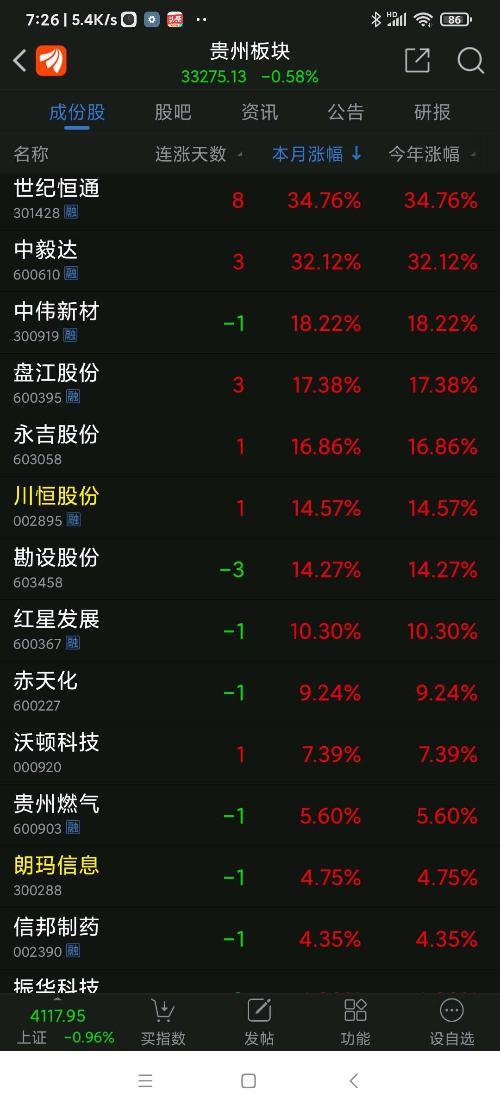 贵州板块26年元月涨幅4.94%,世纪恒通名列贵州板块(共有34个股票)涨幅第一
