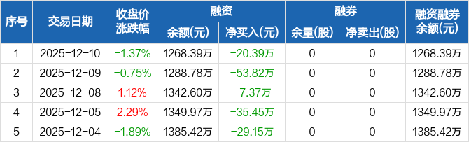 森泰股份:融资余额1268.39万元,创历史新低(12-10)