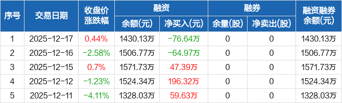 森泰股份:融资净偿还76.64万元,融资余额1430.13万元(12-17)