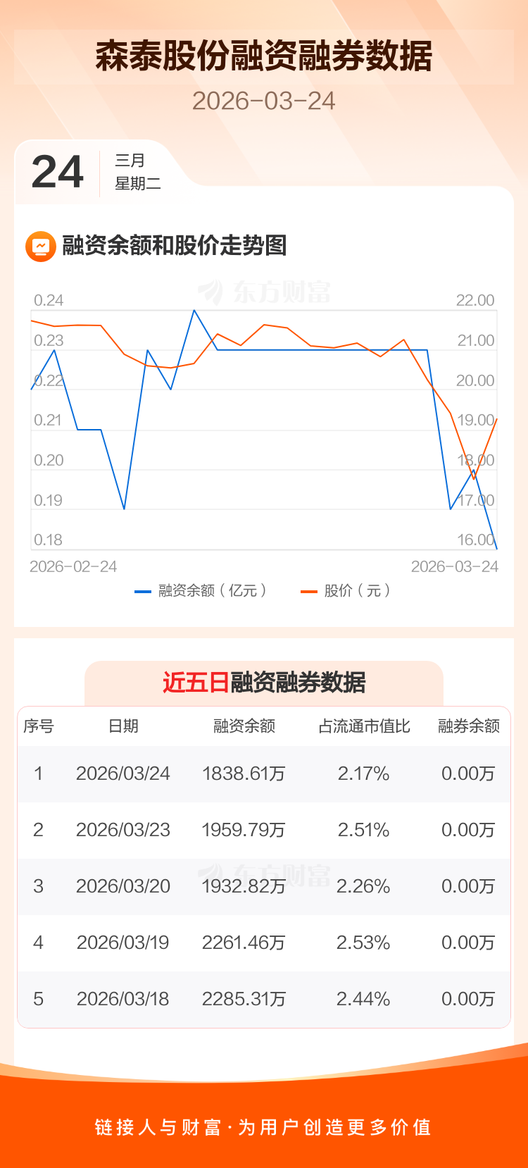 交易所最新数据显示,森泰股份于2026年3月24日获融资买入653.47万元,融资偿还774.66万元,当日融资净偿还121.18万元。目前,该股融资余额1838.61万,占流通市值比例为2.17%。