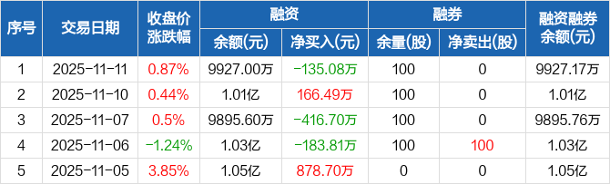 泓淋电力:融资净偿还135.08万元,融资余额9927万元(11-11)