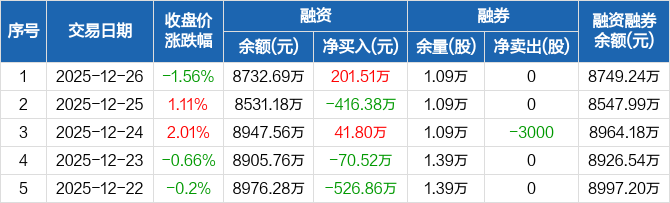 泓淋电力:融资净买入201.51万元,融资余额8732.69万元(12-26)