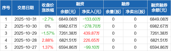 福事特:融资净偿还133.6万元,融资余额6849.08万元(10-31)