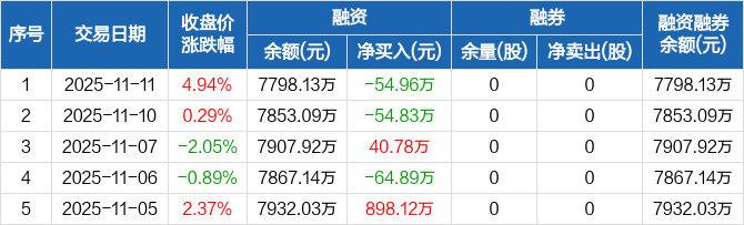 福事特:融资净偿还54.96万元,融资余额7798.13万元(11-11)