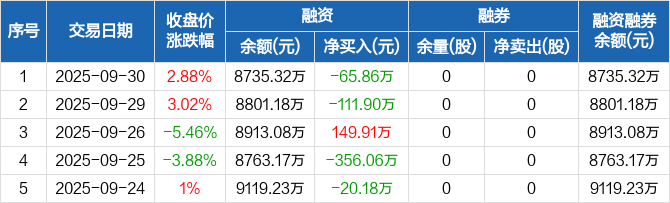 开创电气:融资净偿还65.86万元,融资余额8735.32万元(09-30)