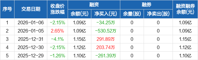 开创电气:融资净偿还34.25万元,融资余额1.09亿元(01-06)
