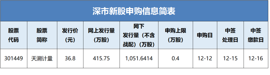 2025年12月12日,深圳天溯计量检测股份有限公司(简称:天溯计量)将通过深交所网下发行电子平台和交易系统发行新股,具体信息如下。