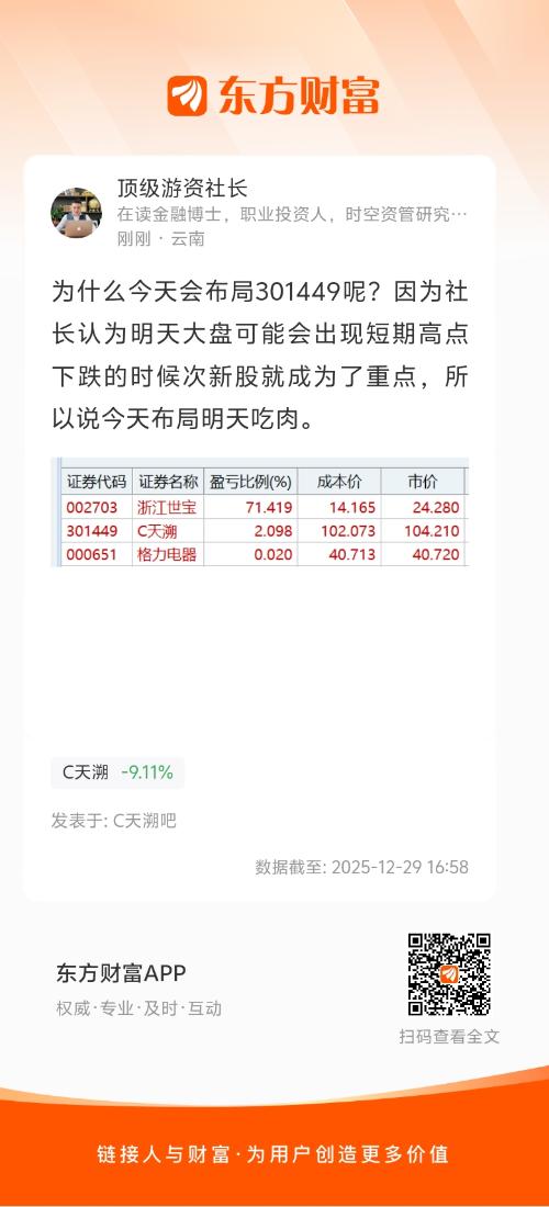 为什么今天会布局301449呢?因为社长认为明天大盘可能会出现短期高点下跌的时候次新股就成为了重点,所以说今天布局明天吃肉。