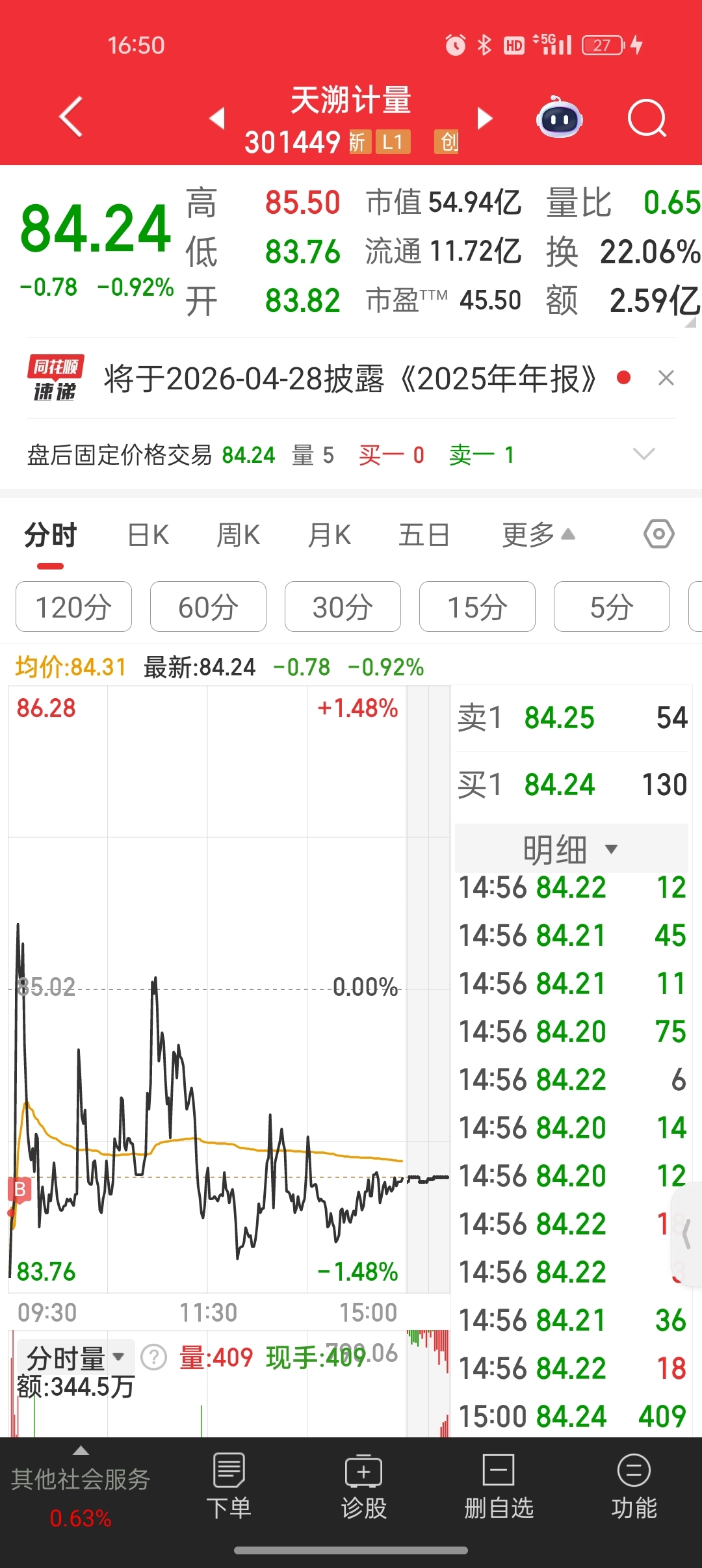 $天溯计量(SZ301449)$ 鄙人不才,全仓买入,杠杆拉满。成本84.097,仓位100%,今日基操已完成晒图如下