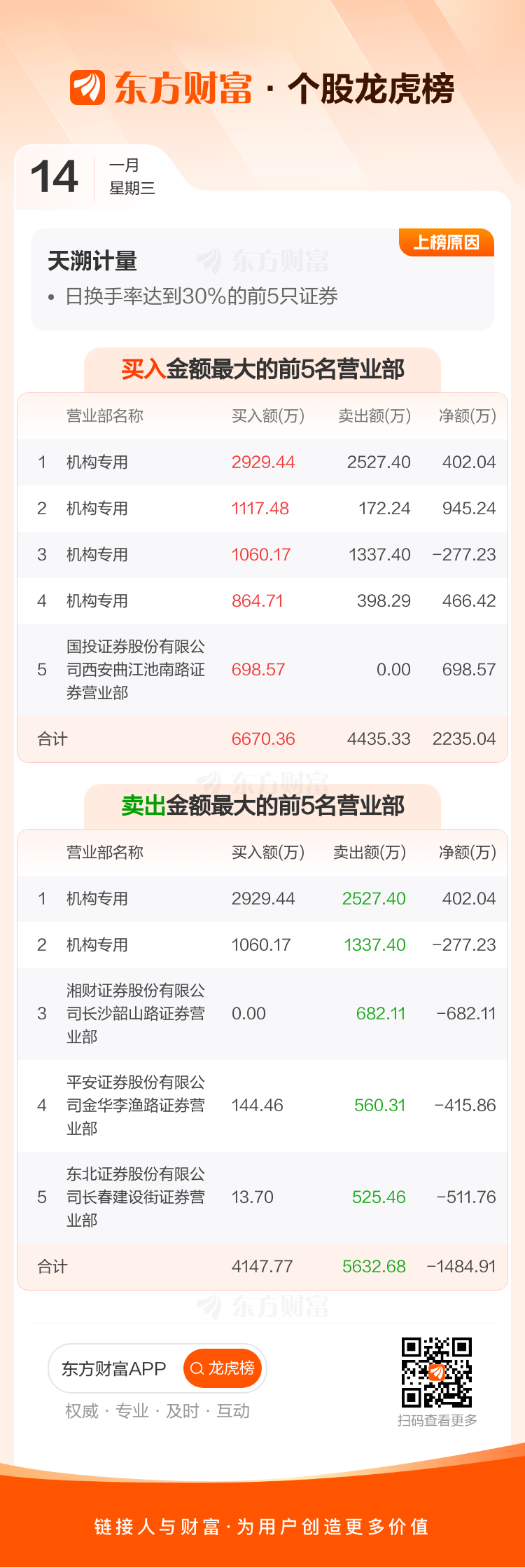 交易所2026年1月14日公布的交易公开信息显示,天溯计量因成为日换手率达到30%的前5只证券上榜。天溯计量当日收报86.73元,涨跌幅7.31%,偏离值43.09%,换手率43.09%,成交额5.11亿。