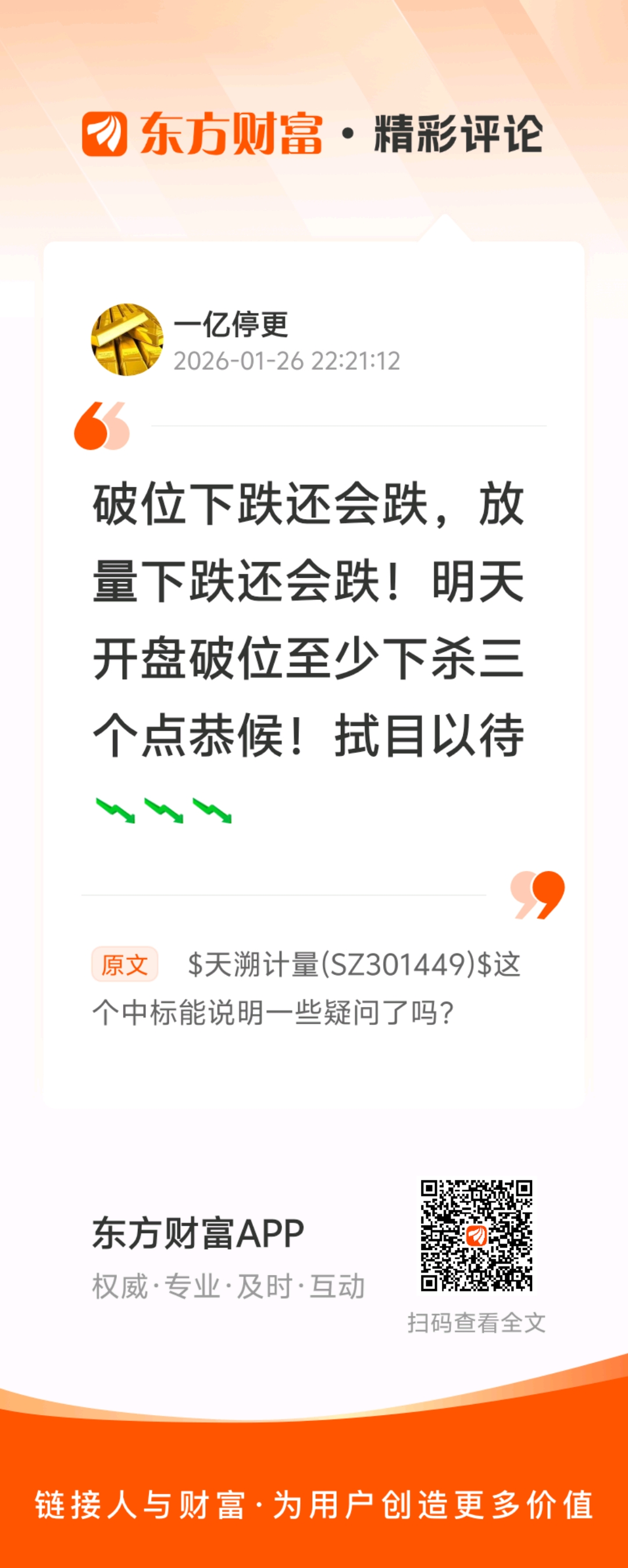 温馨提示: 1.根据《证券法》规定,禁止编造、传播虚假信息或者误导性信息,扰乱证券市场;2.用户在本社区发表的所有资料、言论等仅代表个人观点,与本网站立场无关,不对您构成任何投资建议。用户应基于自己的独立判断,自行决定证券投资并承担相应风险。《东方财富社区管理规定》