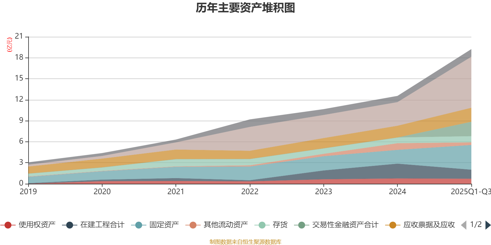 资产重大变化方面,截至2025年三季度末,公司货币资金较上年末增加115.76%,占公司总资产比重上升11个百分点;交易性金融资产合计占公司总资产的10.67%,上年末为0;在建工程合计较上年末减少38.87%,占公司总资产比重下降10.09个百分点;其他流动资产较上年末减少60.65%,占公司总资产比重下降5.67个百分点。