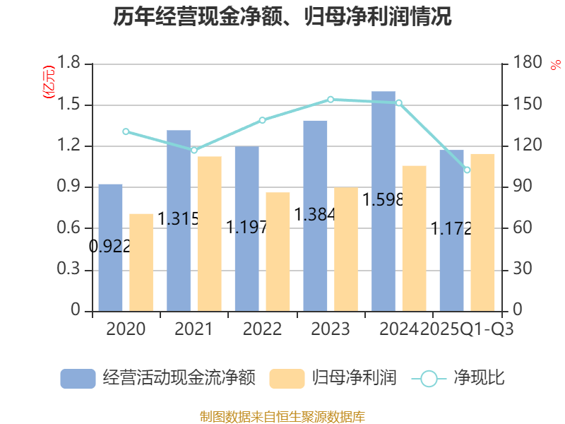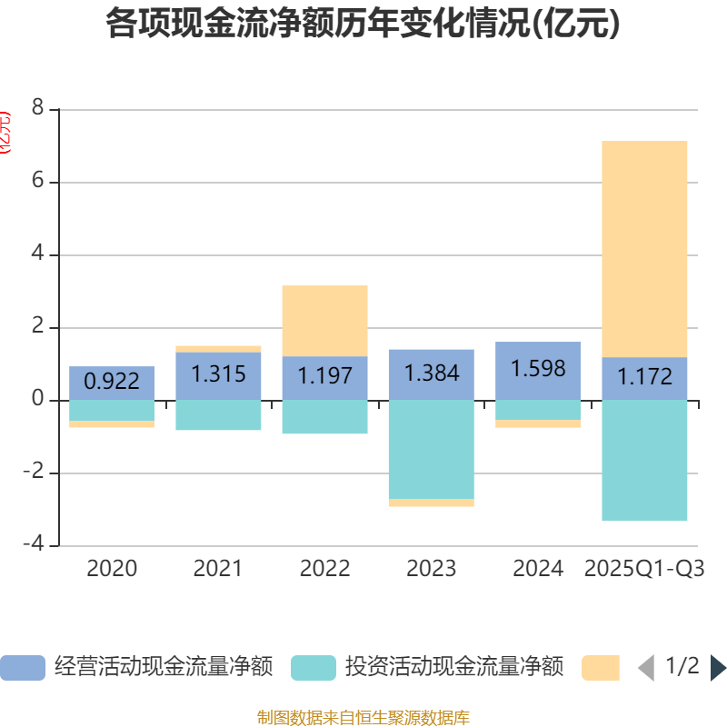 2025年前三季度,公司经营活动现金流净额为1.17亿元,同比增长5.08%;筹资活动现金流净额5.95亿元,同比增加6.09亿元;投资活动现金流净额-3.33亿元,上年同期为-4198.1万元。