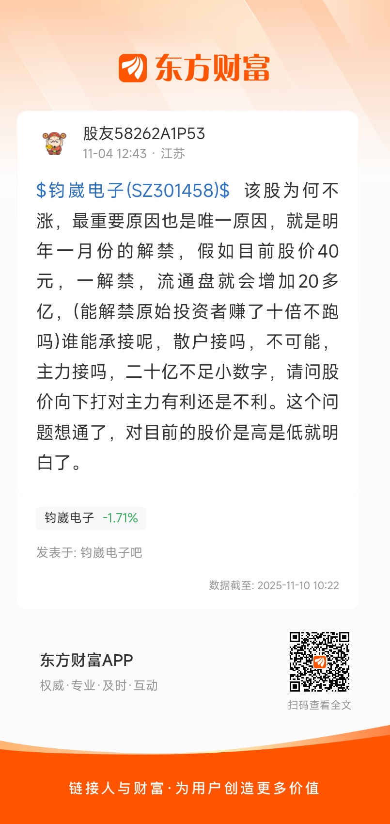 $钧崴电子(SZ301458)$ 该股为何不涨,最重要原因也是唯一原因,就是明年一月份的解禁,假如目前股价40元,一解禁,流通盘就会增加20多亿,(能解禁原始投资者赚了十倍不跑吗)谁能承接呢,散户接吗,不可能,主力接吗,二十亿不足小数字,请问股价向下打对主力有利还是不利。这个问题想通了,对目前的股价是高是低就明白了。