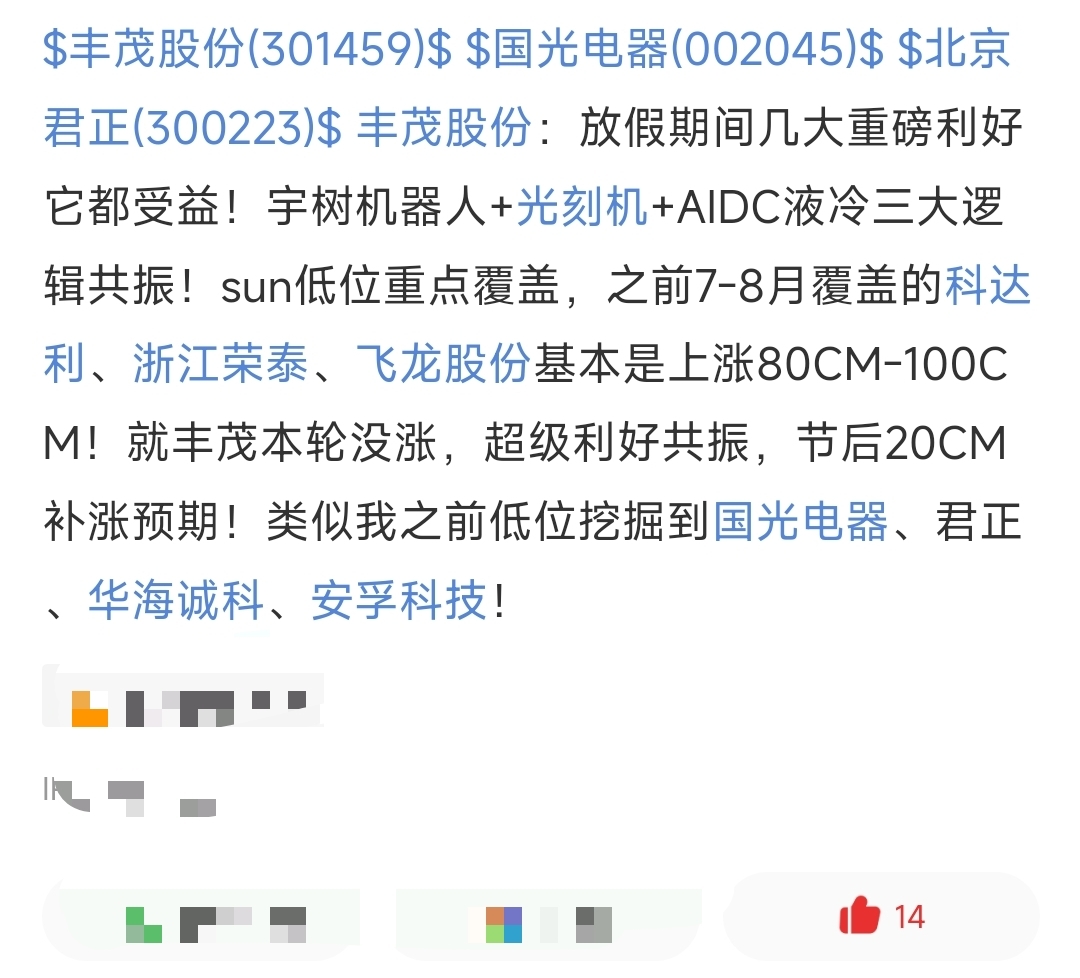 $丰茂股份(SZ301459)$ $国光电器(SZ002045)$ $科达利(SZ002850)$ 假期三大利好共振,逻辑够硬,低位,业绩好,本轮没涨,补涨一个20CM不为过!