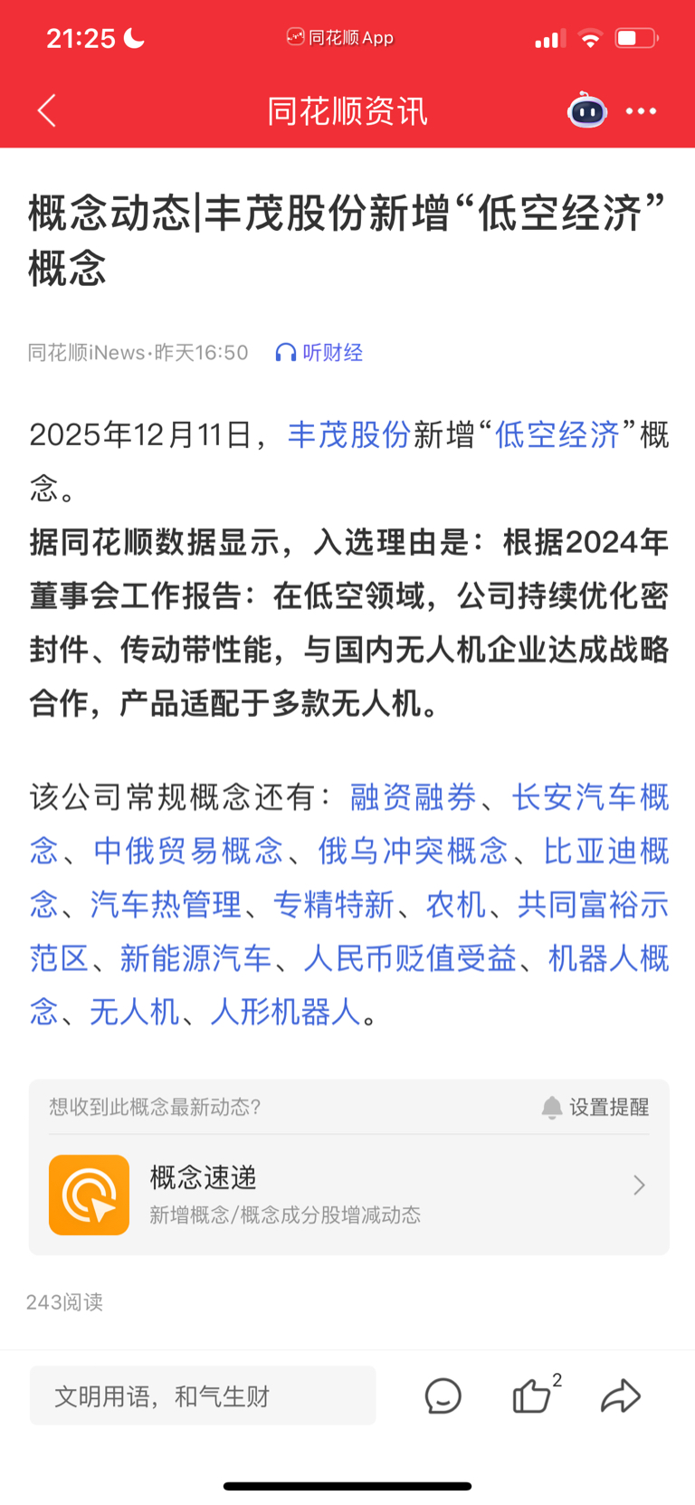 【概念速递】丰茂股份新新增“无人机”概念