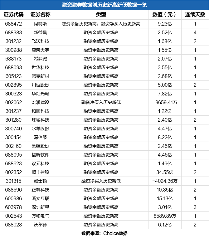 11月3日沪深两市共有149只股票两融数据创历史新高/新低,部分数据如下: