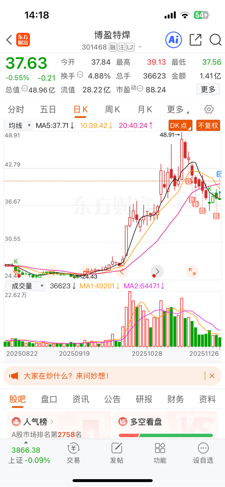 $博盈特焊(SZ301468)$ 早盘T了昨天买的,现在没钱补仓了