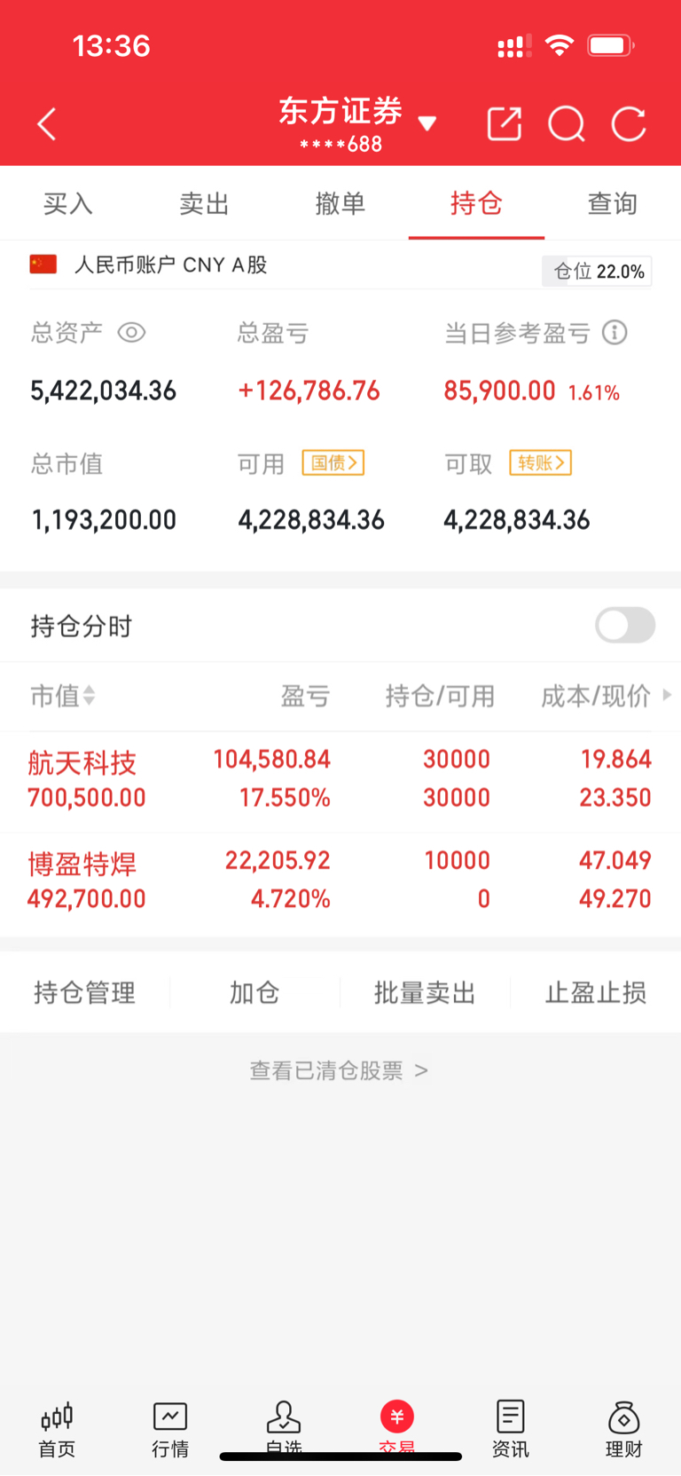 今日买进$博盈特焊(SZ301468)$  继续持有$航天科技(SZ000901)$