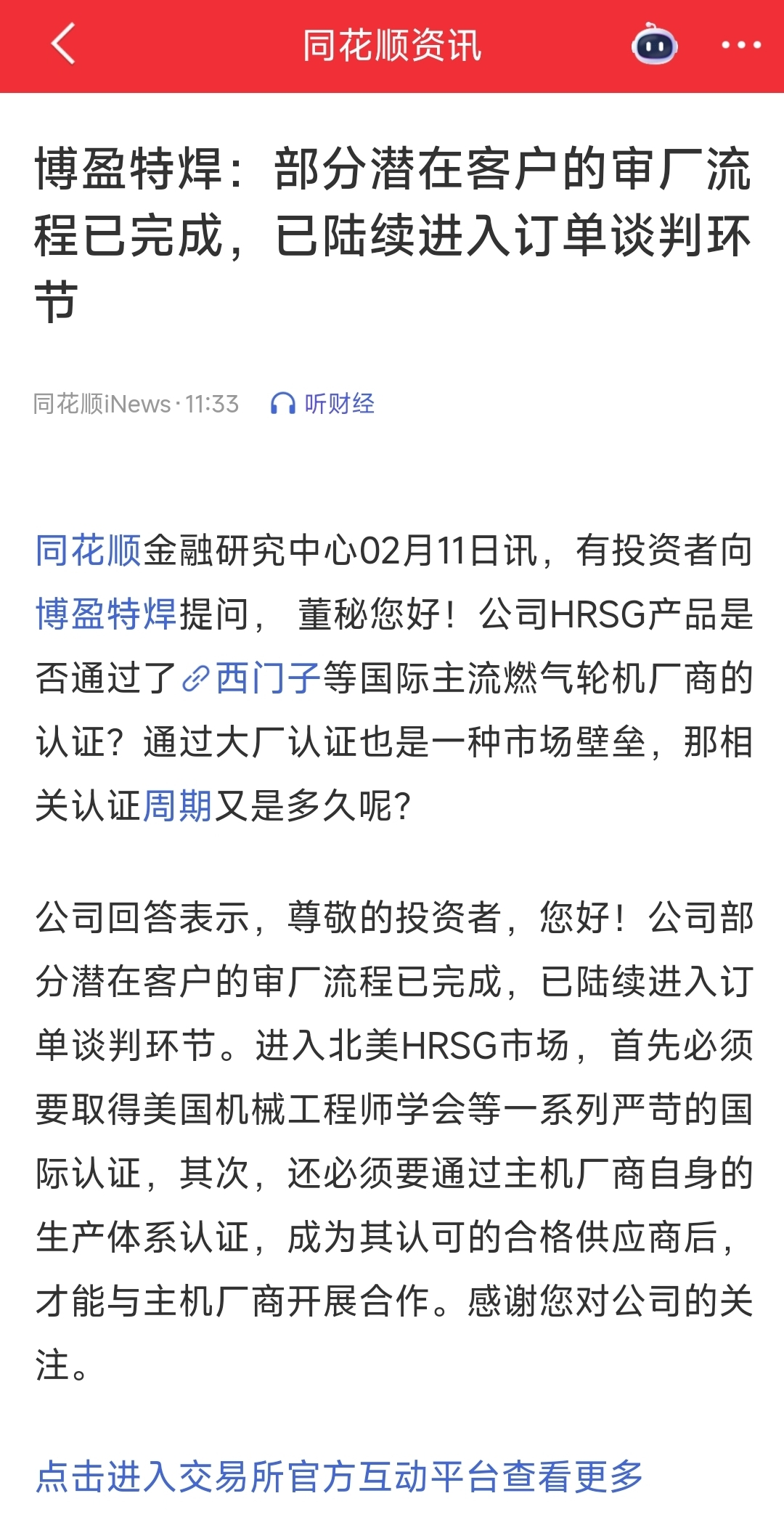 $博盈特焊(SZ301468)$ 最新互动易审厂通过,开始谈订单跟之前的订单传闻对上了gev签订2.5-3亿元订单,5月将与西门子签订十亿元订单。$杰瑞股份(SZ002353)$ $应流股份(SH603308)$