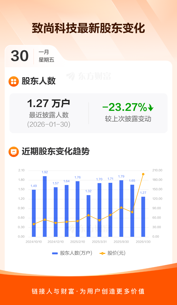 致尚科技:截至1月30日最新股东户数1.27万户,较上期减少23.27%