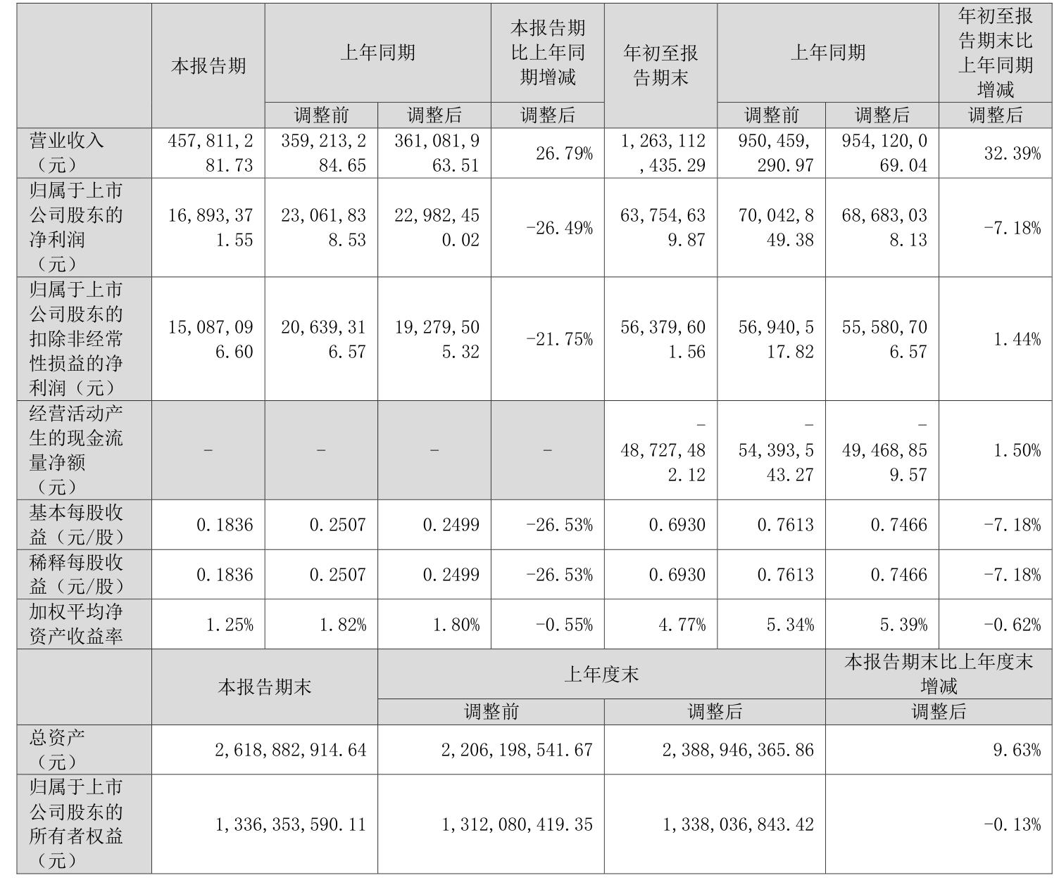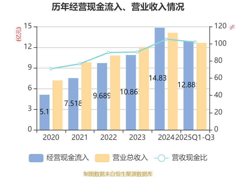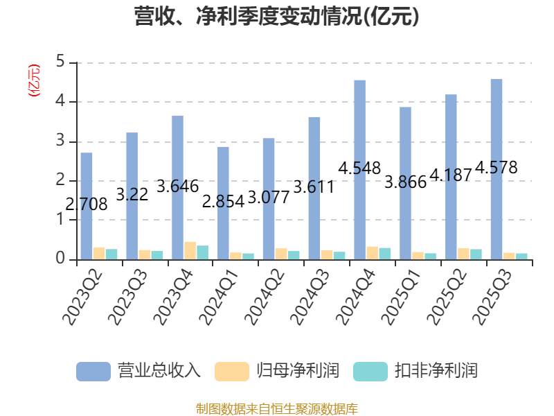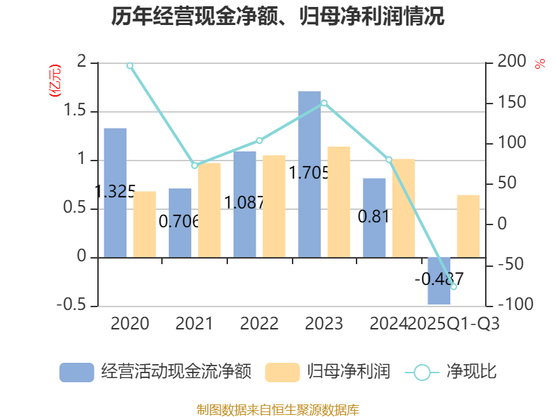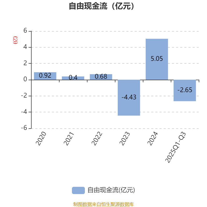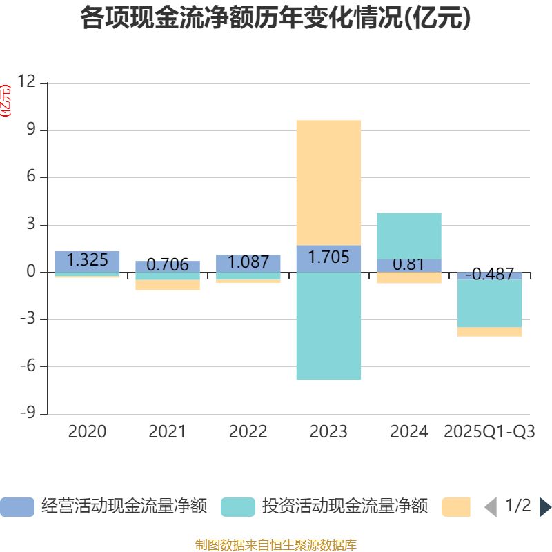 2025年前三季度,公司经营活动现金流净额为-4872.75万元,同比增加74.14万元;筹资活动现金流净额-5717.39万元,同比增加2210.02万元;投资活动现金流净额-3.03亿元,上年同期为-5.47亿元。