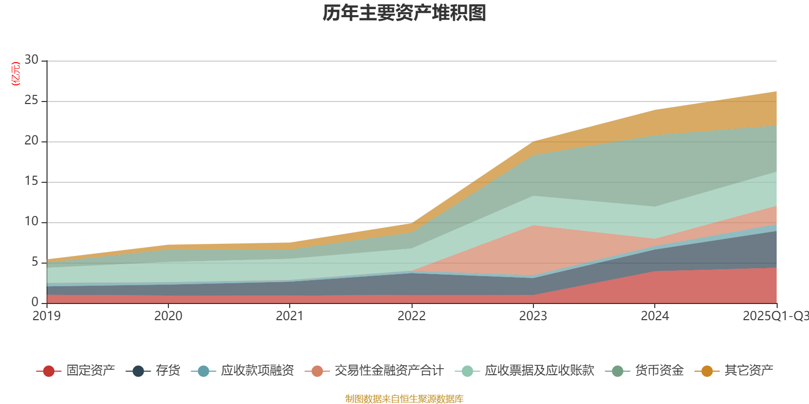 资产重大变化方面,截至2025年三季度末,公司货币资金较上年末减少35.33%,占公司总资产比重下降15.17个百分点;存货较上年末增加70.11%,占公司总资产比重上升6.16个百分点;交易性金融资产合计较上年末增加153.79%,占公司总资产比重上升4.98个百分点;应收款项融资较上年末增加88.89%,占公司总资产比重上升1.34个百分点。