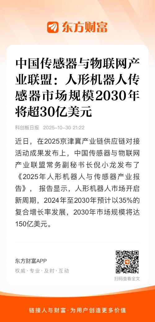 近日,在2025京津冀产业链供应链对接活动成果发布上,中国传感器与物联网产业联盟常务副秘书长倪小龙发布了《2025年人形机器人与传感器产业报告》, 报告显示,人形机器人市场开启新周期,2024年至2030年预计以35%的复合增长率发展,2030年市场规模将达150亿美元。传感器作为机器人核心部件,单机成本占比20%-22%,据此测算,2030年人形机器人领域的传感器市场规模将超过30亿美元。