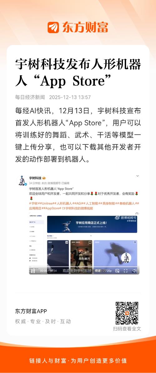 每经AI快讯,12月13日,宇树科技宣布首发人形机器人“App Store”,用户可以将训练好的舞蹈、武术、干活等模型一键上传分享,也可以下载其他开发者开发的动作部署到机器人。